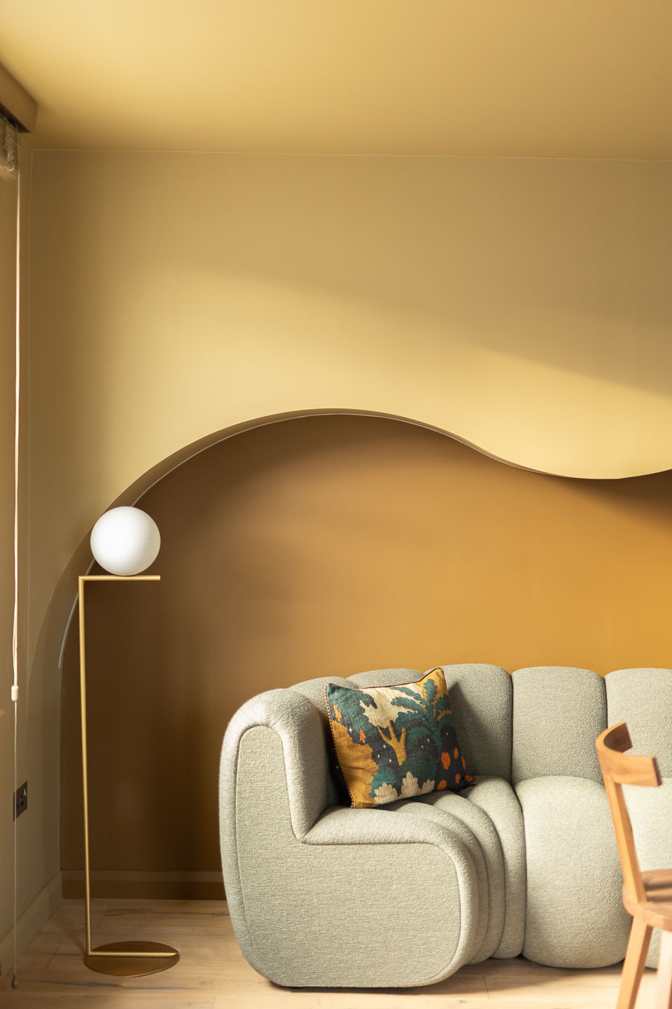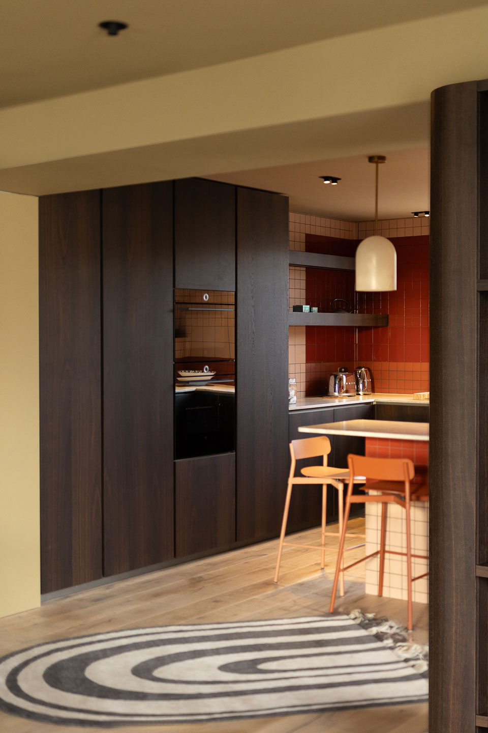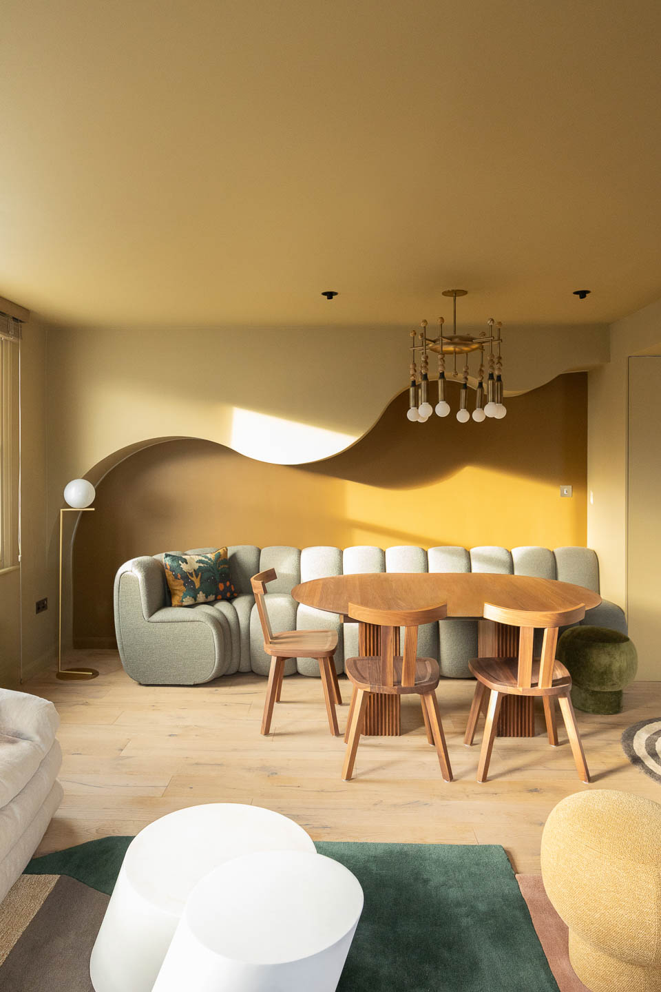 Dans ce pied-à-terre de 118 m² à Maida Vale, la salle à manger devient le cœur du projet. La menuiserie ondulante structure l’espace avec finesse, tandis que le canapé d’angle généreux et la table en noyer créent une atmosphère à la fois graphique, chaleureuse et résolument contemporaine.