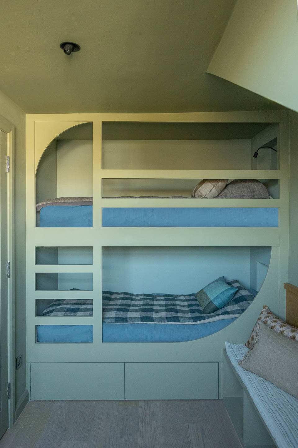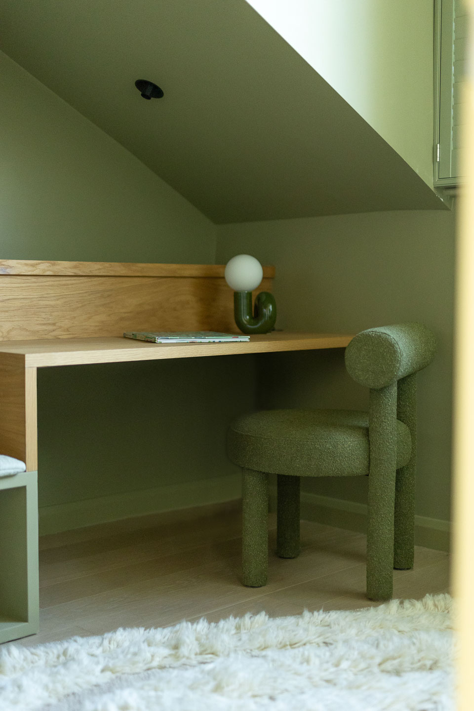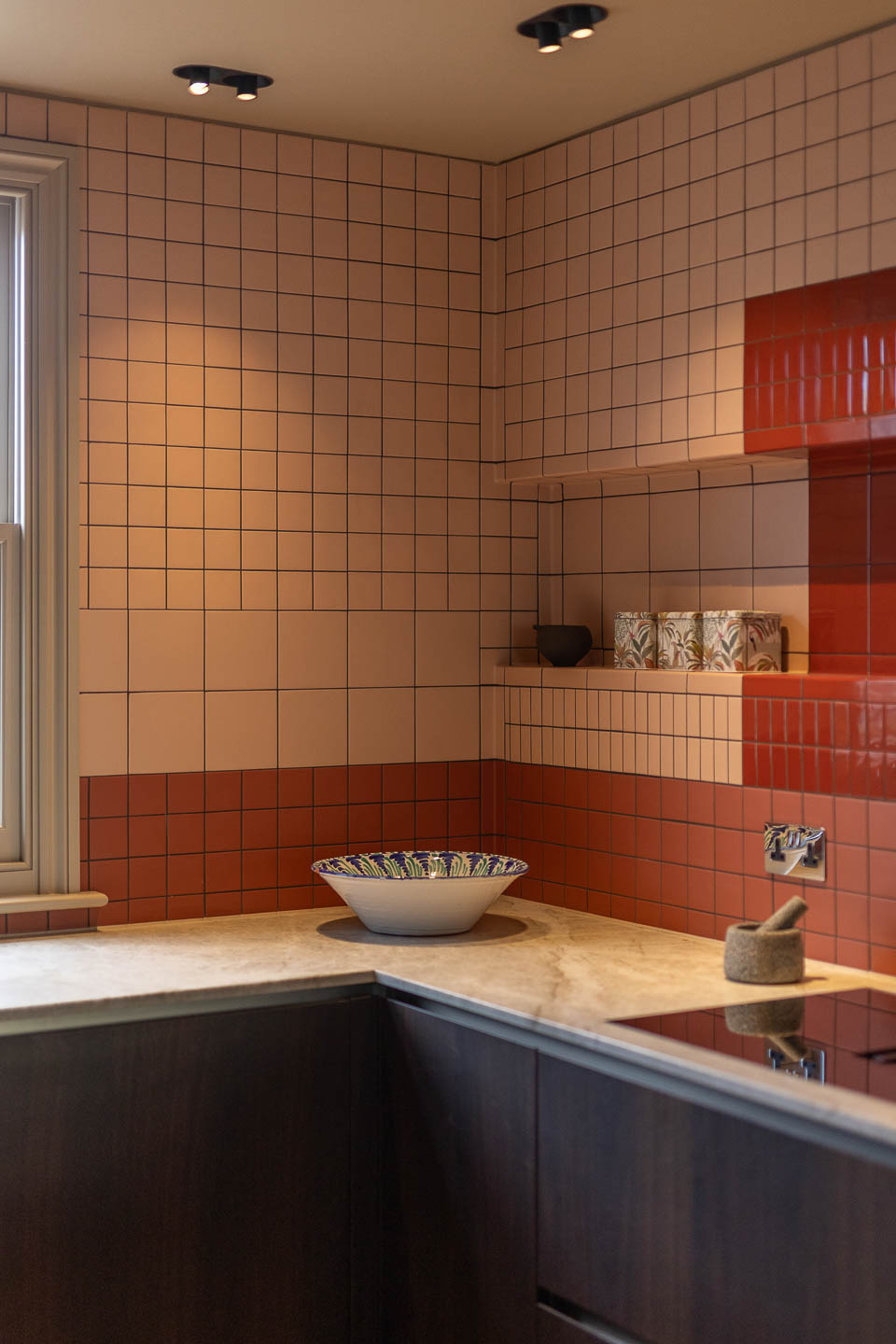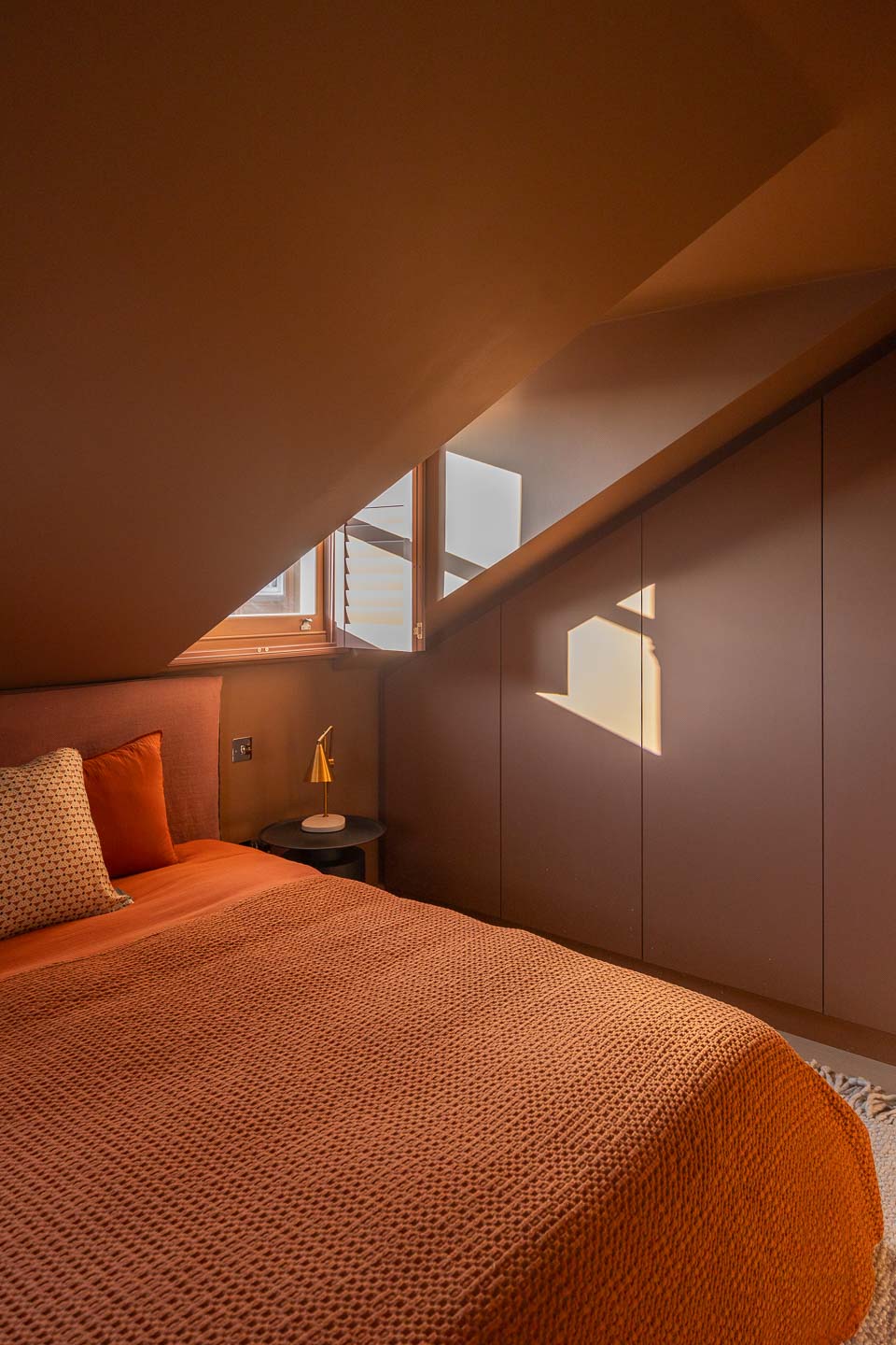 Dans ce pied-à-terre de 118 m² à Maida Vale, la salle à manger devient le cœur du projet. La menuiserie ondulante structure l’espace avec finesse, tandis que le canapé d’angle généreux et la table en noyer créent une atmosphère à la fois graphique, chaleureuse et résolument contemporaine.