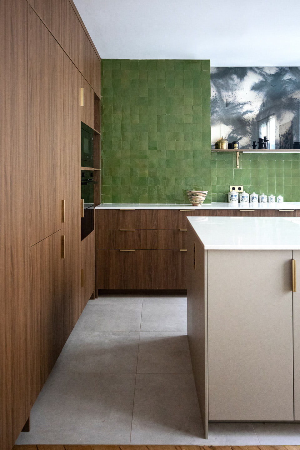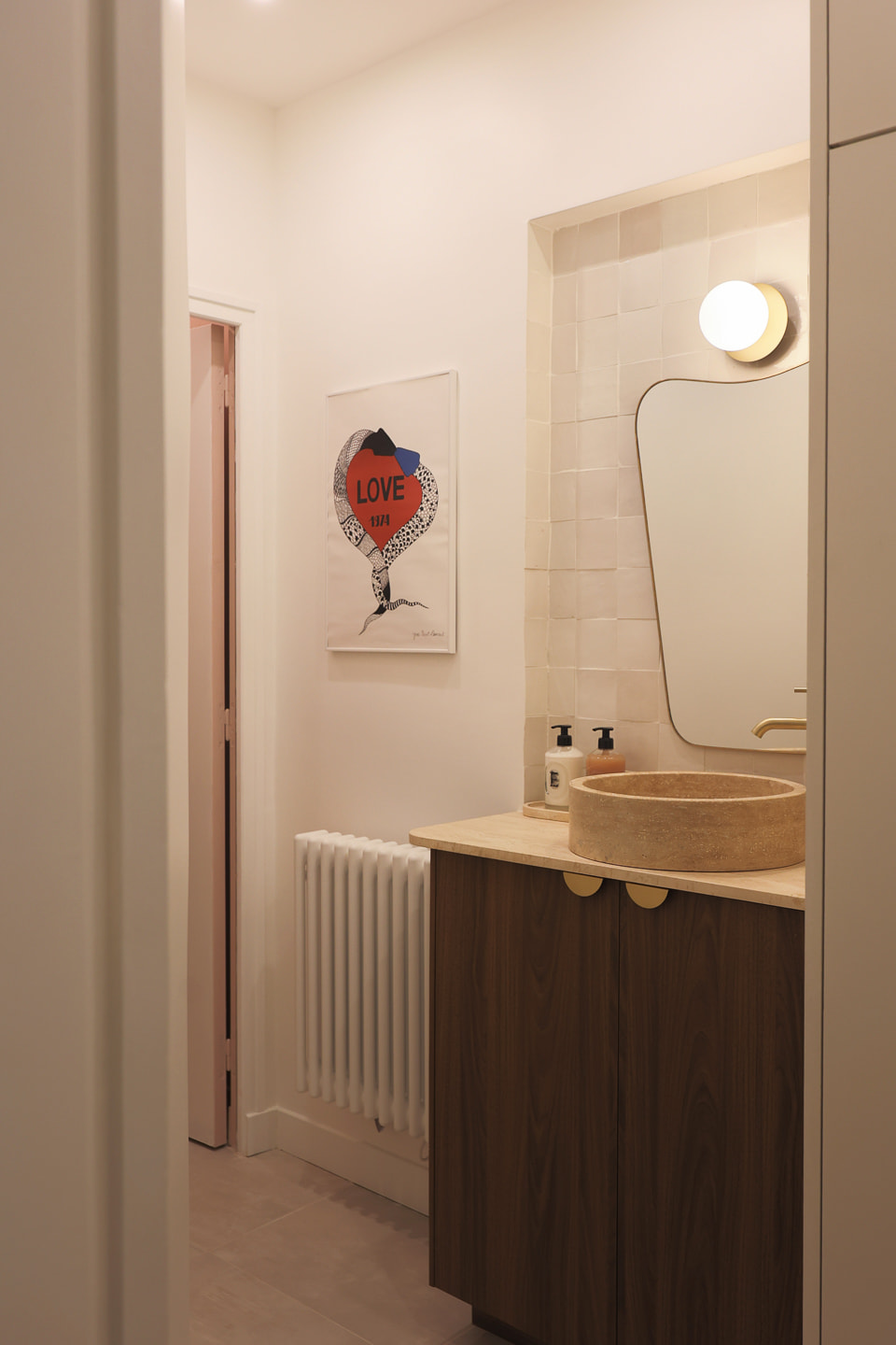 Dans l’ensemble de l’appartement, le charme de l’ancien s’exprime pleinement, magnifié par des choix esthétiques audacieux où couleurs et matières naturelles se répondent. Dans la cuisine comme dans la salle de bain de la suite parentale, le vert, le zellige et le noyer servent de fil conducteur, subtilement réveillés par une touche de rose faisant écho aux WC et au papier peint de la salle à manger. Un projet pensé comme une véritable parenthèse poétique.